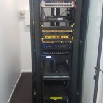 - Cat6 data cabling neatly terminated and dressed into patch panel within communications rack.